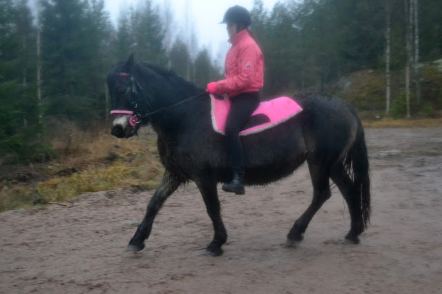 ja tallin prinsessalla on tottakai kaikki varusteet pinkkiä! Ihastelkaa tätä ainutkertaista näkyä, minä pinkissä! |